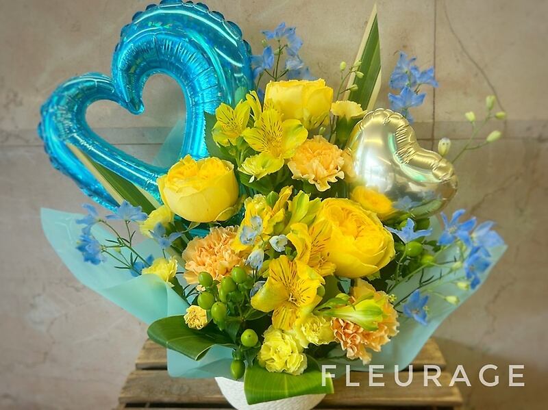 オープンハートのバルーンとイエロー系のお花たちと合わさって、より素敵なアレンジになりました♪