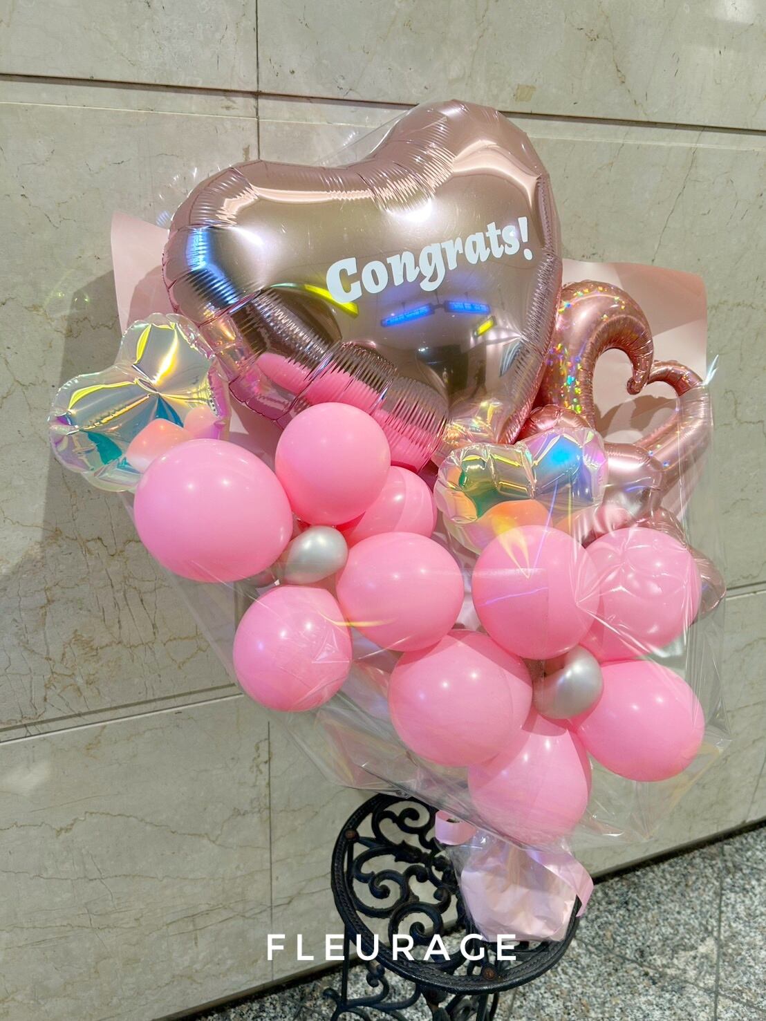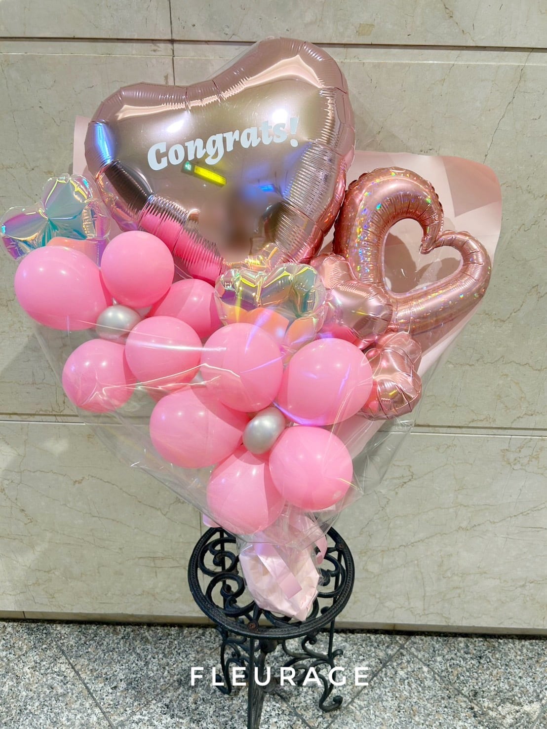 ハートのバルーンにCongrats!お祝いメッセージの花束です。