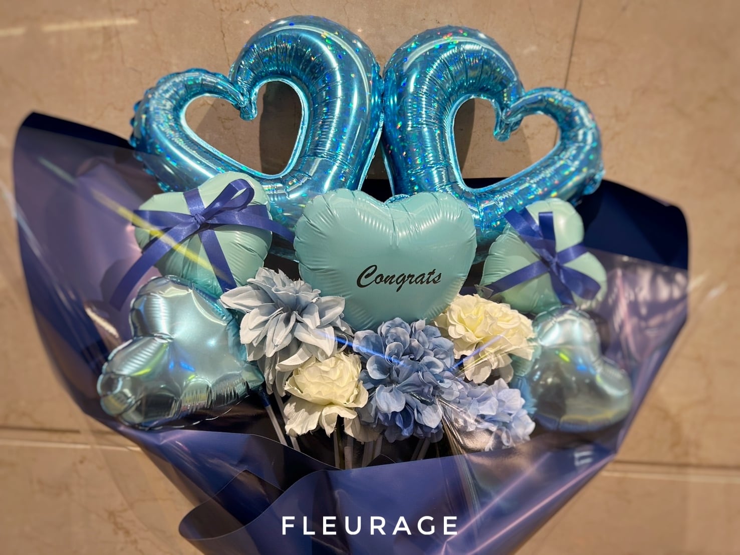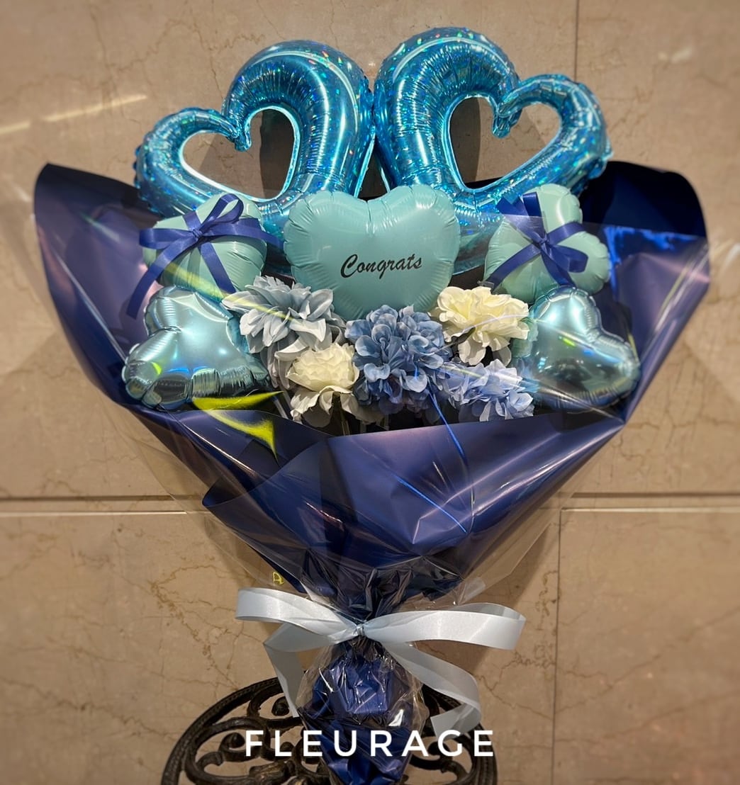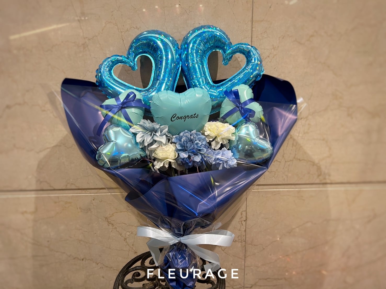 きらめくオープンハートバルーンとブルー系のお花を組み合わせた華やかなバルーンブーケです。
