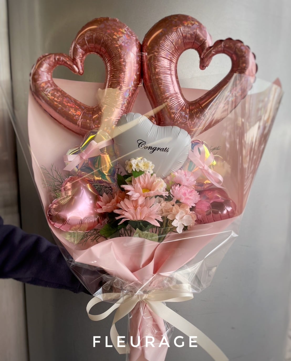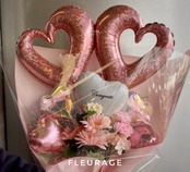きらめくオープンハートバルーンとピンク系のお花を組み合わせた華やかなバルーンブーケです。