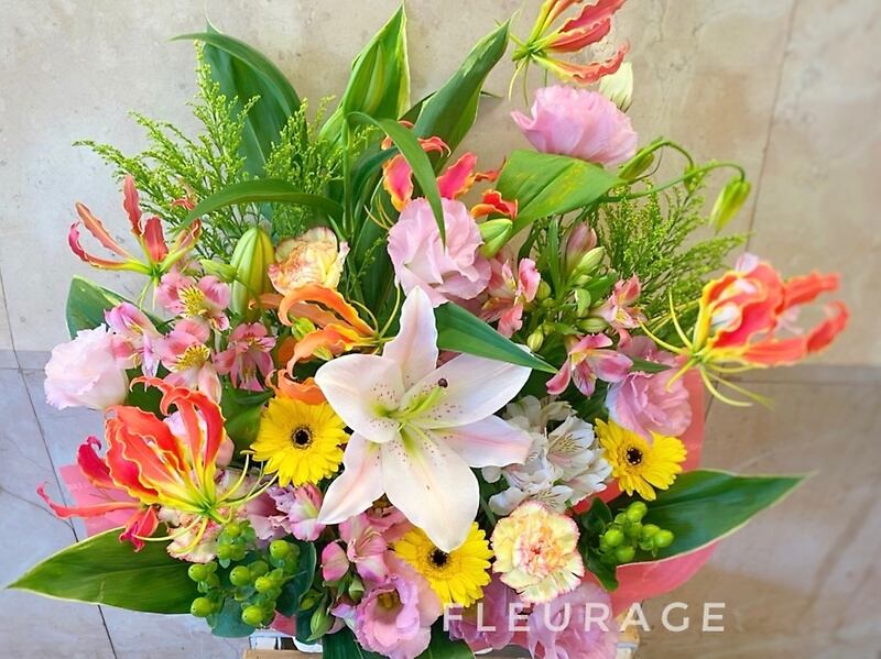 ピンク、イエロー、オレンジなどパッと華やぐ色合わせのお花たち。自然に笑顔がこぼれます!