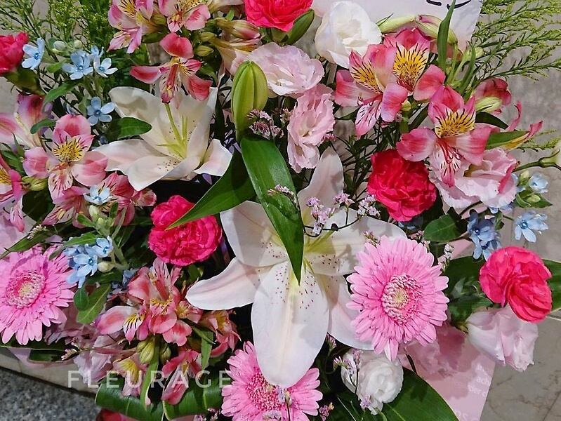 明るいお花の色合わせは、どんなシーンでも喜ばれます!ピンク系のお花たちがメインのユリを引き立てていて、よりいっそう華やかです!