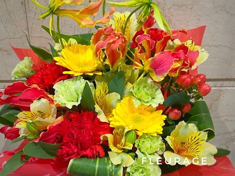 パッと目を引く、赤×黄×オレンジのアレンジ♪華やかなイメージがお祝いのギフトにぴったりですね!